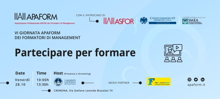 La Giornata nasce nel segno della condivisione: non un semplice contenitore di argomenti, ma un momento di confronto e di scambio aperta agli associati APAFORM e a tutti coloro che sono interessati a una riflessione generativa sul tema.