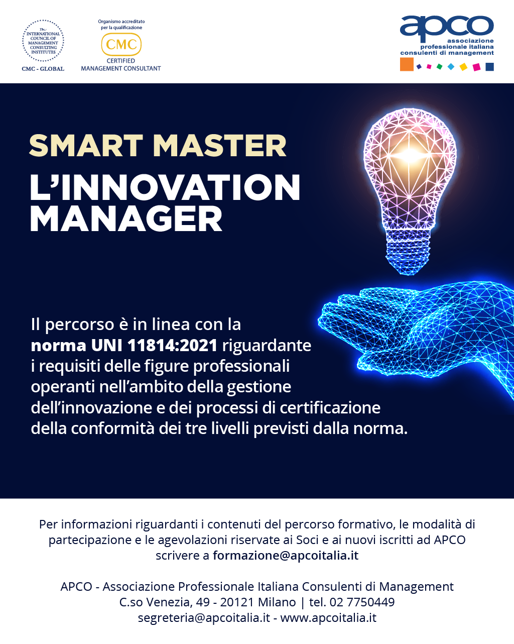 Il Presidente di APCO Dott.ssa Cesara Pasini e il Coordinatore Scientifico dello Smart Master Dott. Mario Gibertoni sono lieti di invitarvi al webinar di presentazione il prossimo 7 luglio alle ore 17:00 in cui saranno illustrate le finalità dello Smart Master, i contenuti del programma e la propedeuticità alla certificazione di conformità alla norma UNI 11814:2021.