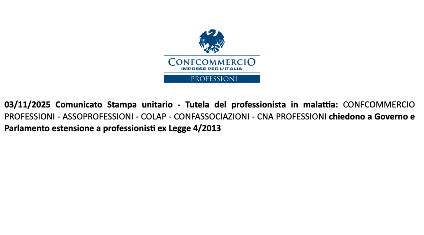 Le Confederazioni CONFCOMMERCIO PROFESSIONI – ASSOPROFESSIONI – COLAP – CONFASSOCIAZIONI – CNA PROFESSIONI, in rappresentanza delle Associazioni professionali dei professionisti ex Legge 4/2013, hanno inviato a rappresentanti di Governo e Parlamento, una richiesta unitaria di estendere ai professionisti disciplinati dalla Legge 4/2013 iscritti alla gestione separata Inps il provvedimento di sospensione dei termini degli adempimenti tributari propri dei professionisti e gestiti per conto dei propri assistiti in caso di malattia, infortunio, maternità e malattia dei figli minori, una sospensione finora garantita esclusivamente ai professionisti iscritti in albi.